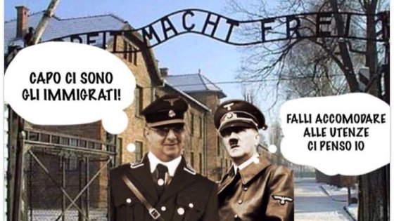L’immagine shock su FB condivisa su Facebook da Daria Katarzyna Janik, cittadina polacca e presidente del comitato “Giù le mani dalla Montello”. Si tratta di un gruppo di residenti della zona di piazza Firenze a Milano che si oppone all’annunciato arrivo di 300 profughi che saranno ospitati in via temporanea nella caserma Montello. Nel fotomontaggio, si vede un gerarca nazista che, di fronte all’ingresso di un campo di sterminio, rivolgendosi a Hitler dice: “Capo, ci sono gli immigrati”. Il dittatore risponde: “Falli accomodare, alle utenze ci penso io”, con chiaro riferimento alle camere a gas. A denunciare la comparsa dell’immagine in rete sono gruppi democratici del quartiere, fra cui Anpi del Municipio 8, che da settimane denunciano “il diffondersi di un clima razzista nella zona”.