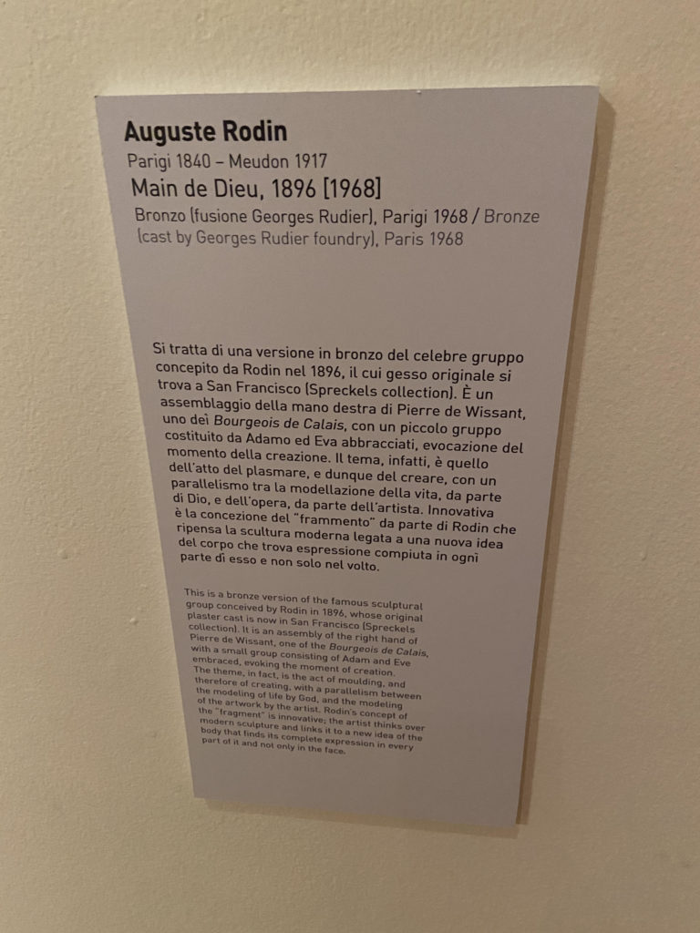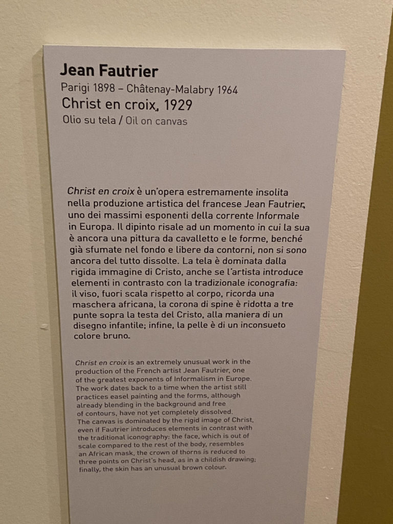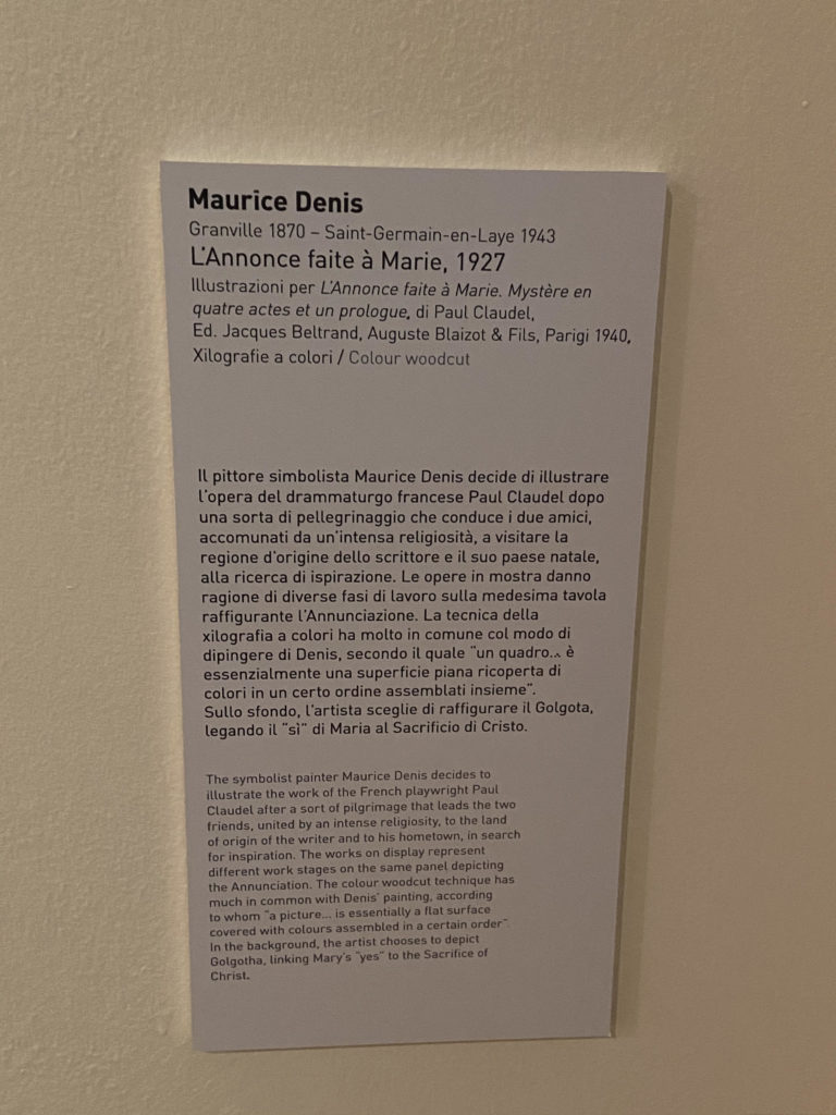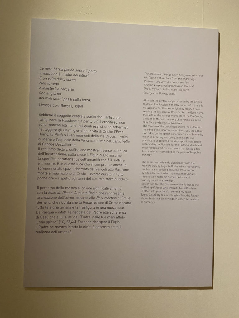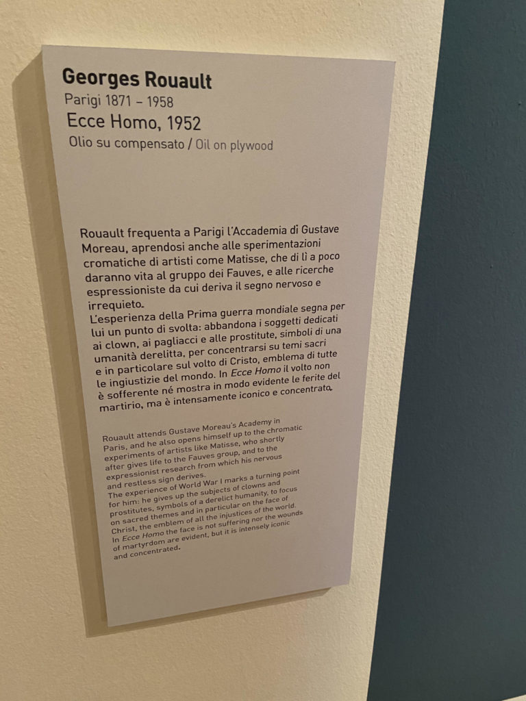 Gli artisti in mostra (Matisse, Gauguin, Rodin, Denis, Rouault e altri), con stili, linguaggi e tecniche differenti, tentano di dare una risposta, anche tramite la sperimentazione, alle domande profonde che legano l’Uomo all’Assoluto, trascendendo il particolare in favore di un significato più alto del nostro passaggio in Terra.