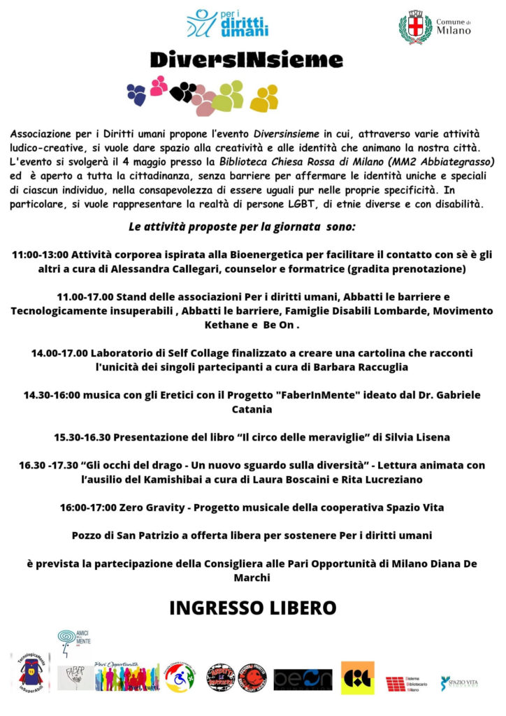 SAVE THE DATE: sabato 4 maggio, presso Biblioteca Chiesa rossa a Milano. Orario: 11-18. Evento organizzato da Associazione Per i Diritti umani