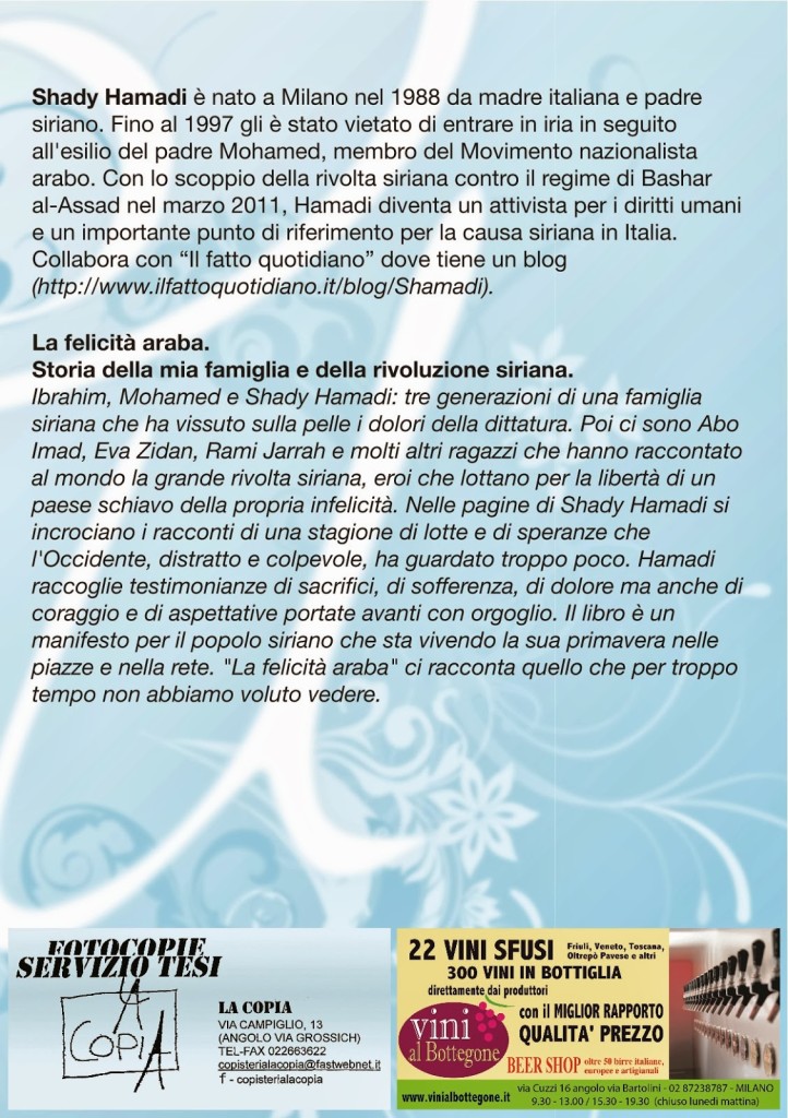 Vi ricordiamo l’incontro di domani sera, mercoledì 16 ottobre, con Shady Hamadi sul suo libro “La felicità araba. Storia della mia famiglia e della rivoluzione siriana”