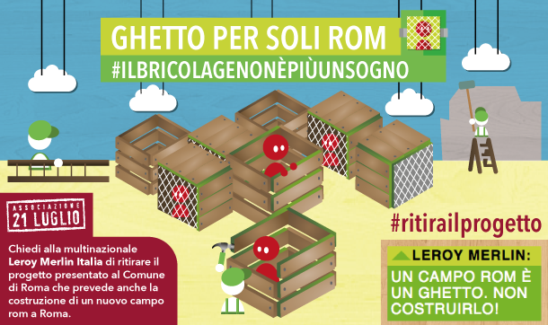 «Leroy Merlin: un campo rom è un ghetto. Non costruirlo!», è l’appello dell’Associazione 21 luglio che invita cittadini e utenti del web a inviare un’email, con un semplice clic dal sito della campagna, direttamente a Leroy Merlin Italia per chiedere alla multinazionale di non sporcarsi la faccia e di non farsi coinvolgere nella creazione dell’ennesimo ghetto per rom a Roma.«Diffonderemo la campagna anche all’estero, chiederemo alle persone di condividerla sui social media e di unirsi così alla nostra battaglia per dire basta alla creazione di nuovi ghetti per soli rom», afferma l’Associazione 21 luglio.