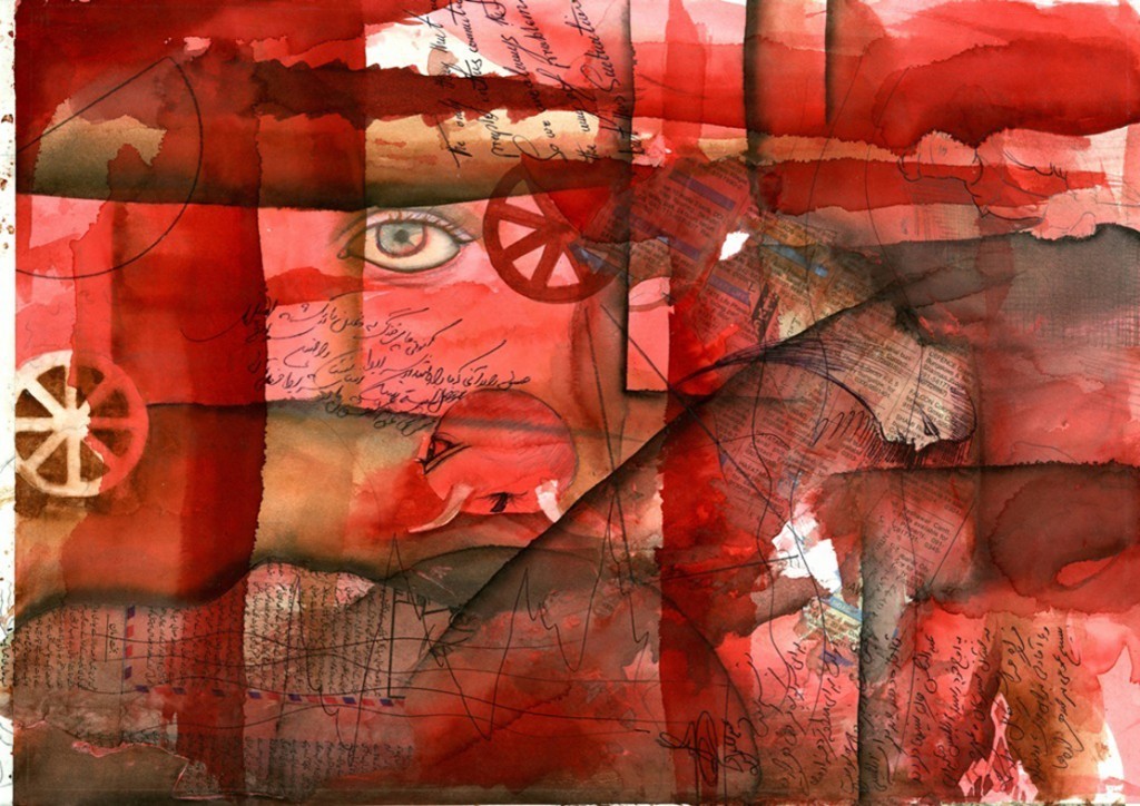 Specchi, colori vivaci, scritte in arabo e in persiano; figure deformate, corpi senza volto; miniature e quel rosso scarlatto che ritorna spesso per colpire lo sguardo in memoria di sangue e di vita.