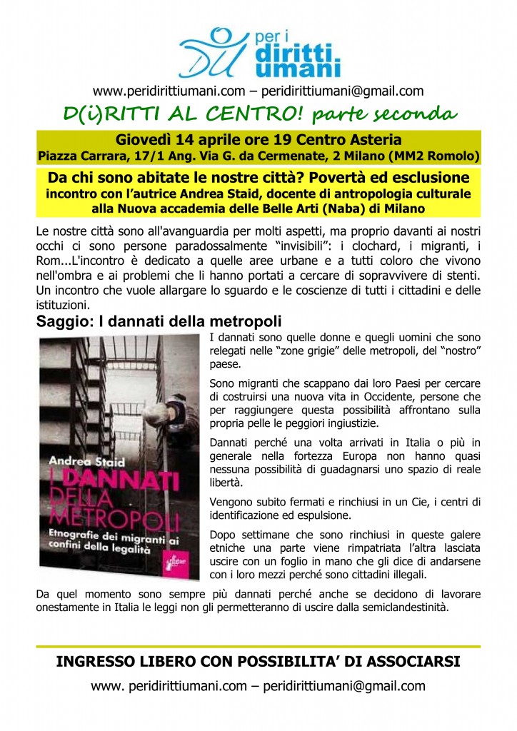 Ecco a voi, care e cari, il secondo appuntamento della prossima settimana per la manifestazione “D(i)RITTI al CENTRO!”. Un incontro in cui si parlerà, con ANDREA STAID, delle persone vulnerabili che abitano le nostre città, in particolare poveri e migranti, ma non solo. Con riferimenti all’architettura sociale.