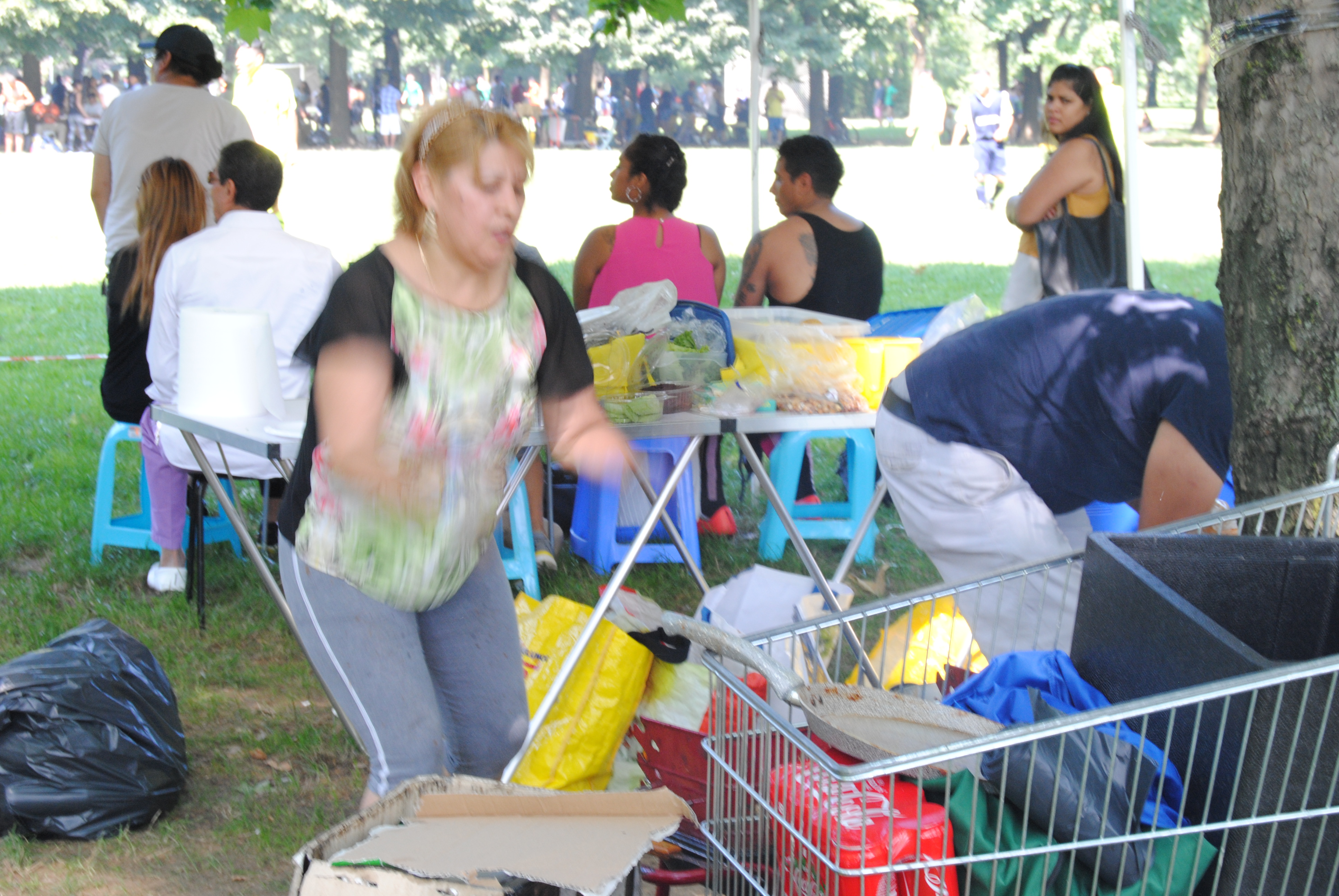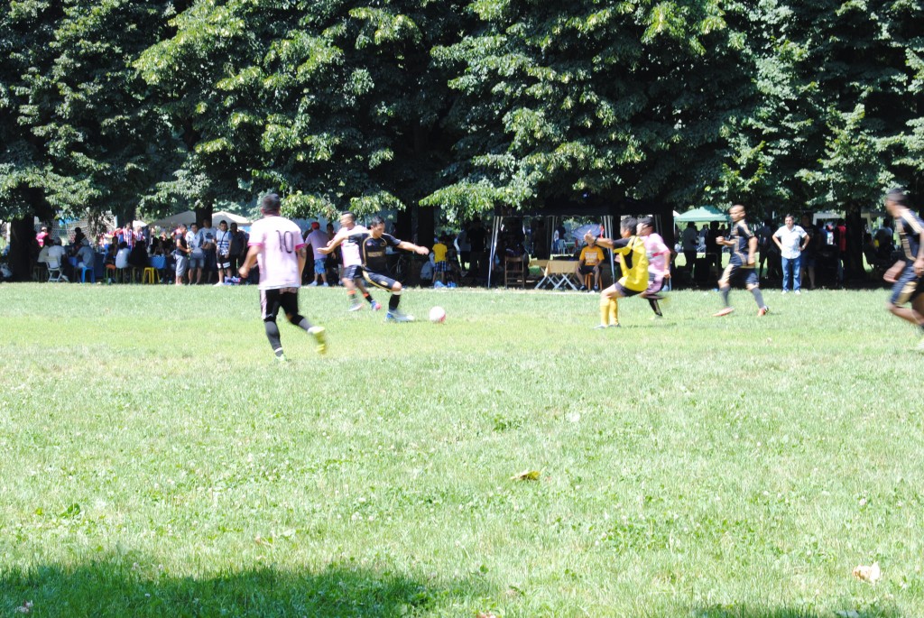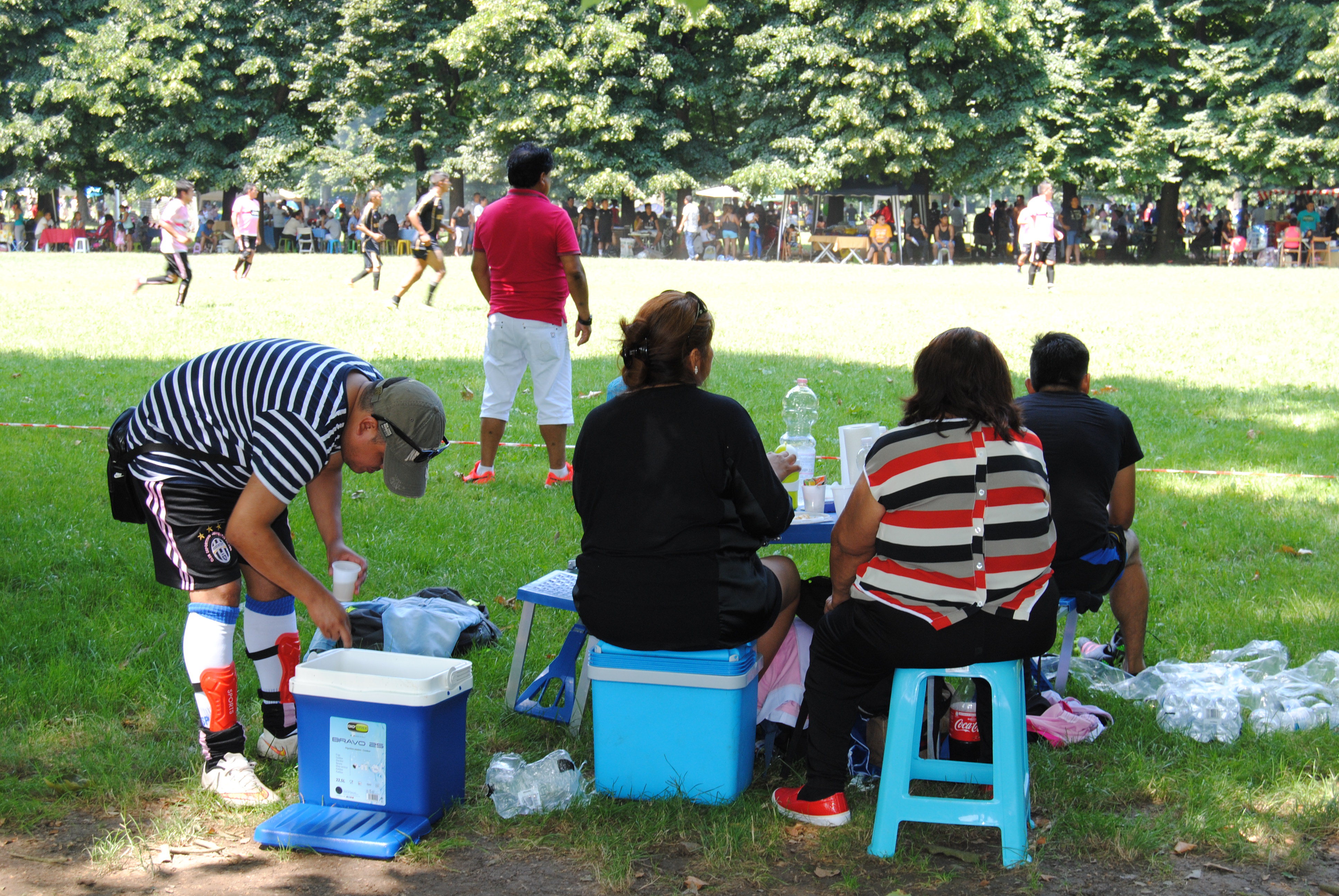 I ragazzi giocano ad un torneo di calcio e le loro fidanzate aspettano che finisca la partita, chiacchierando; i bambini guardano, giocano a carte, si sdraiano sull’erba; le donne servono i loro uomini sui tavolini imbanditi per il pranzo, parlano, ridono…Con una certa divisione netta di ruoli.