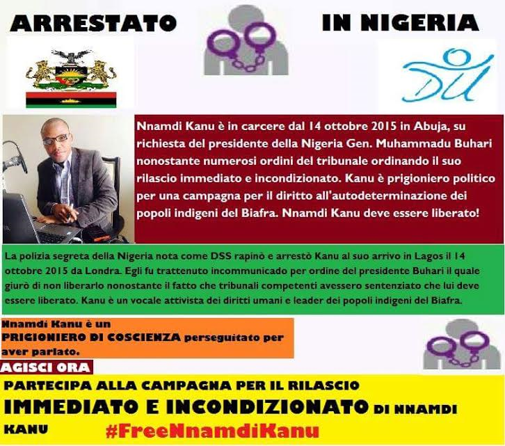 Nnamdi Kanu è un cittadino britannico, in carcere dal 14 ottobre 2015 in Abuja, su richiesta del presidente della Nigeria Gen. Muhammadu Buhari, nonostante i numerosi ordini del tribunale che richiede il suo rilascio immediato e incondizionato. Kanu è prigioniero politico per una campagna per il diritto all’autodeterminazione dei popoli indigeni del Biafra.