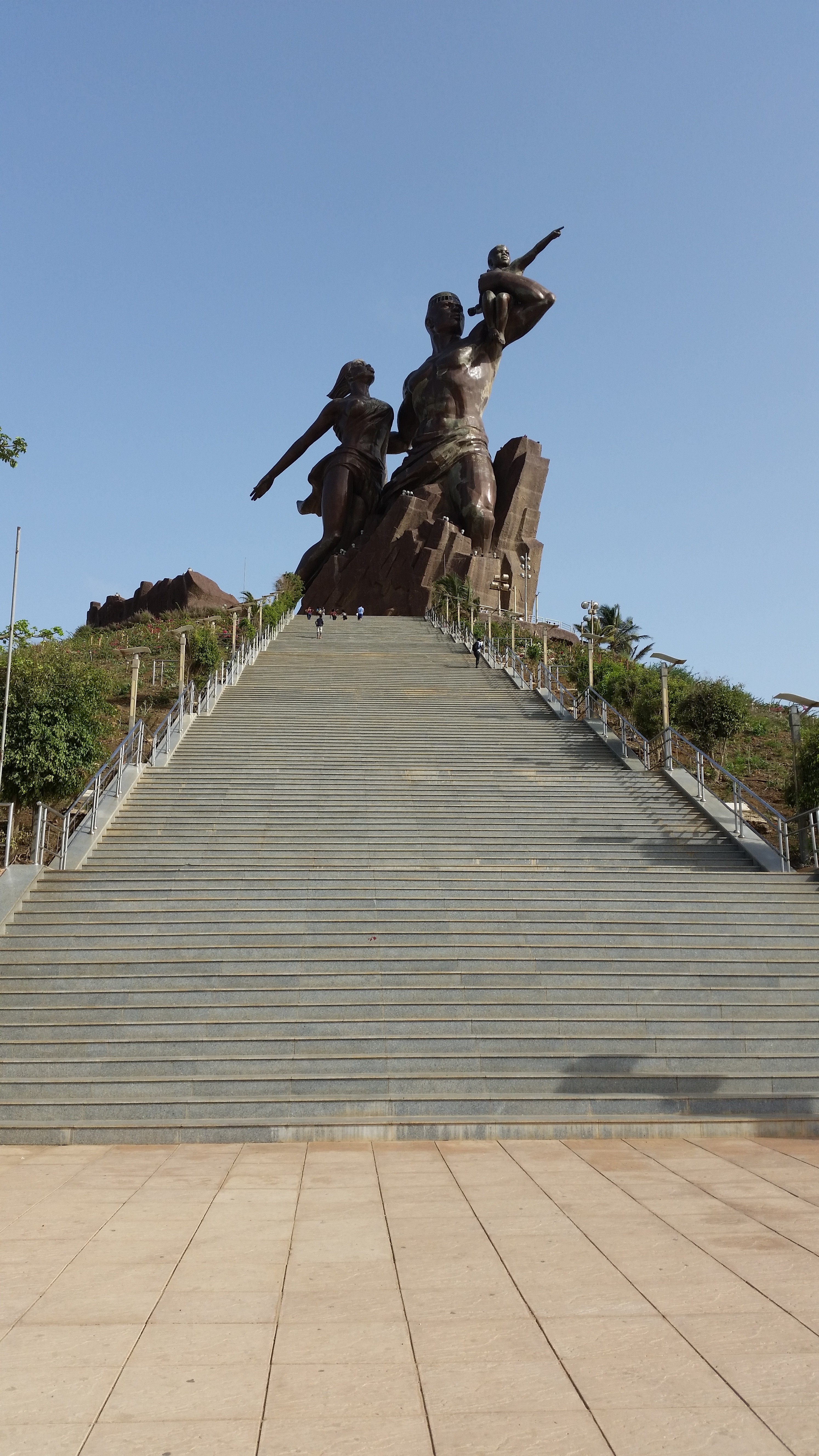 Monumento voluto e finanziato da 17 Paesi africani: un uomo che guarda fiero verso l’alto (libertà), con un bambino in braccio che punta il dito verso l’Oceano, verso la costa dell’America (futuro) e una donna tenuta per mano con lo sguardo fisso verso l’isola di Gorèe (ricordo).