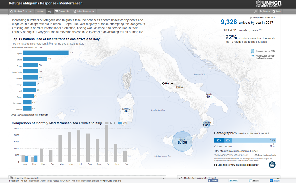 La cartina sottostante è stata estrapolata dal sito www.unhcr.it che aggiorna e monitora, ora per ora, il numero di arrivi, le nazionalità degli immigrati e tutto ciò che concerne lo stato attuale dell’immigrazione. La situazione è chiaramente molto grave, da gennaio 2017 gli arrivi sulle coste europee sono stati 10.991, un numero spaventoso considerando l’attuale situazione dell’accoglienza europea.