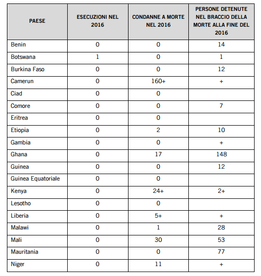 Considerando il continente per intero, quindi, il numero di esecuzioni si è quasi dimezzato rispetto al 2015. Nello stesso periodo due stati hanno abolito la pena di morte: il Benin e la Guinea. In Benin “nessuna disposizione di legge contenuta nell’ordinamento giuridico interno può più contenere menzione della pena capitale”.