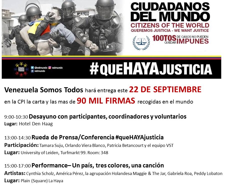 Il 22 settembre è un’importante giornata per il Venezuela. L’organizzazione no profit “Venezuela somos todos” consegnerà davanti alla Corte Penale Internazionale dell’Aia una lettera e un faldone gigantesco contenente più di 90 mila firme raccolte in tantissimi paesi del mondo per chiedere formalmente, appunto al tribunale internazionale con sede nei Paesi Bassi, di avviare finalmente le indagini contro il governo del Venezuela per violazione sistematica dei diritti umani e crimini di lesa umanità. E’ programmata una conferenza stampa e diverse attività per sensibilizzare ancora di più l’opinione pubblica.