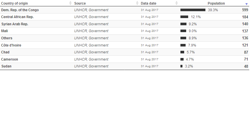 La Nigeria, ancora piegata dai terroristi di Boko Haram, costringe i suoi civili a scappare oltre il lago Chad. Questa situazione di difficile risoluzione porta, inoltre, molte persone a diventare apolidi a causa dei continui spostamenti. È interessante fare un focus anche sui rifugiati presenti in questi paesi, in Nigeria sono circa 1.523 e qui di seguito possiamo vedere le loro nazionalità: