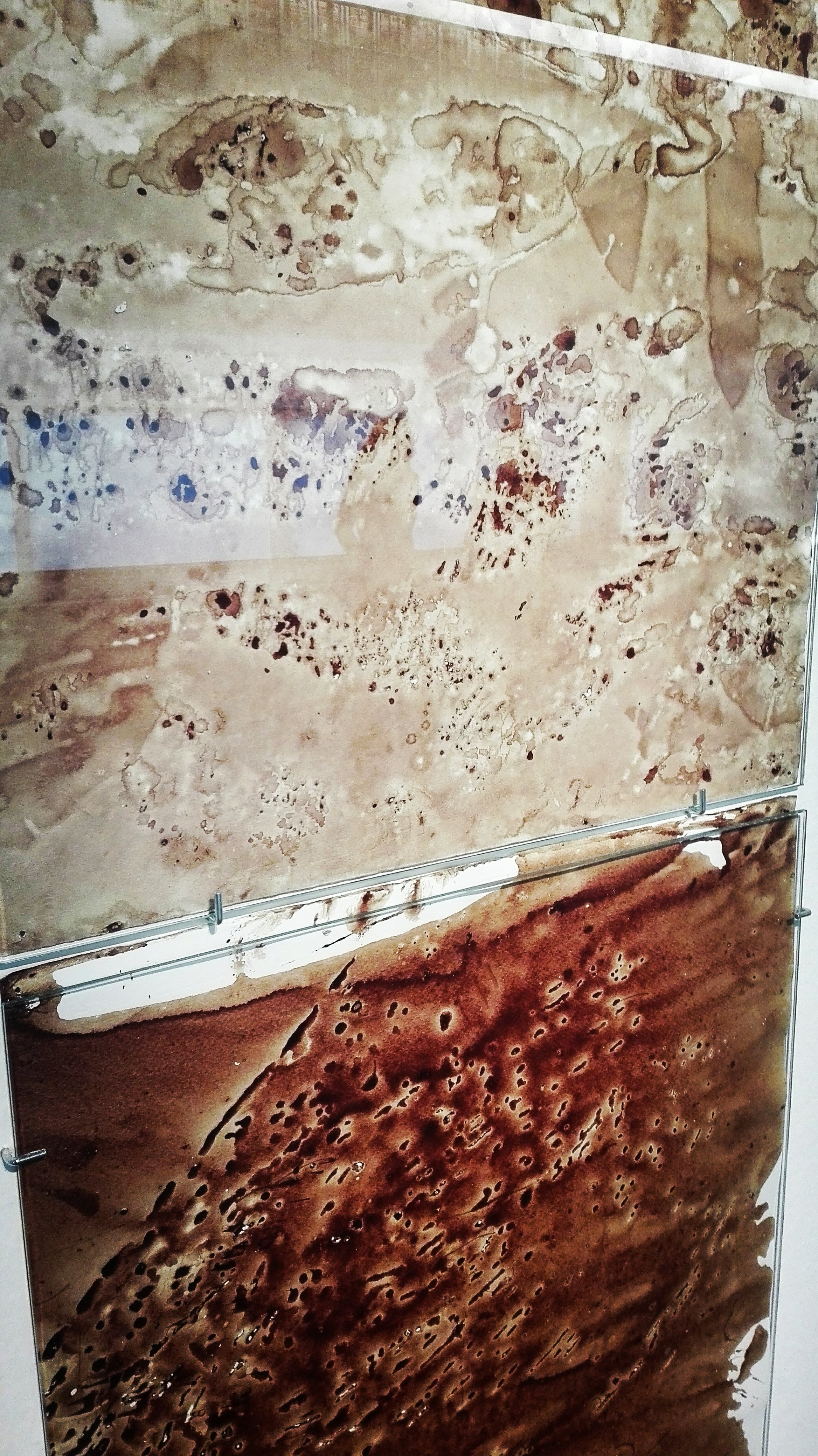 Fogli di carta di Fabriano, posti uno sopra l’altro, che presentano forme astratte, di colore rosso in varie gradazioni. Si tratta di fluidi corporei e acqua, recuperati in un obitorio del Messico per farci riflettere sul tema della violenza diffusa, a più livelli.
