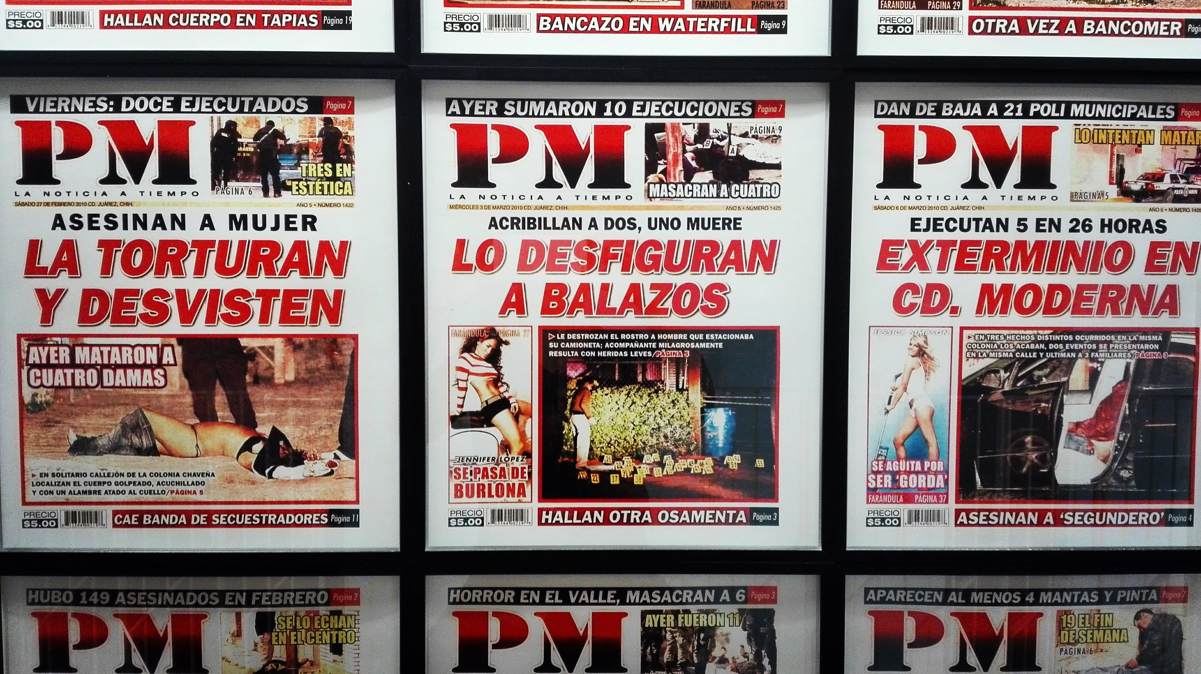 Nel 2006, il Presidente Felipe Calderòn ha avviato la guerra contro la droga per sconfiggere il narcotraffico, ma questo ha fatto scoppiare la violenza che è culminata nel 2010, anno che è stato considerato il più sanguinoso nella Storia del narcotraffico del Messico. 313 copertine di quell’anno della rivista PM: quotidiano di Ciudad Juárez. Persone ammazzate, armi, corruzione e, sempre, corpi di donne nude, in pose volgari.