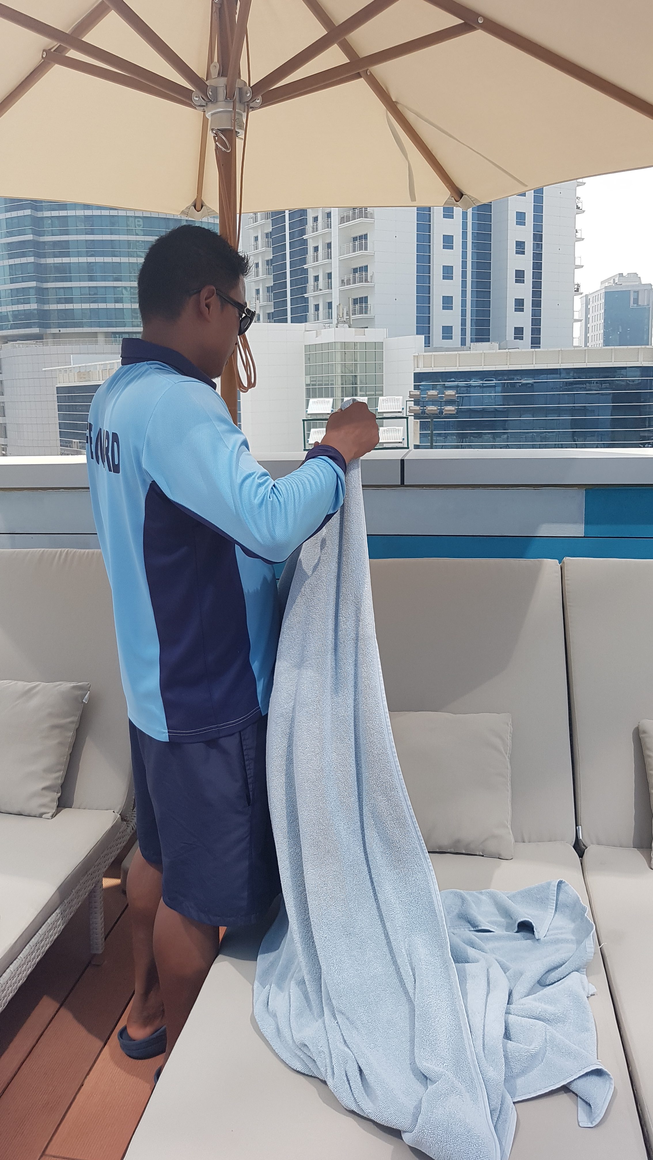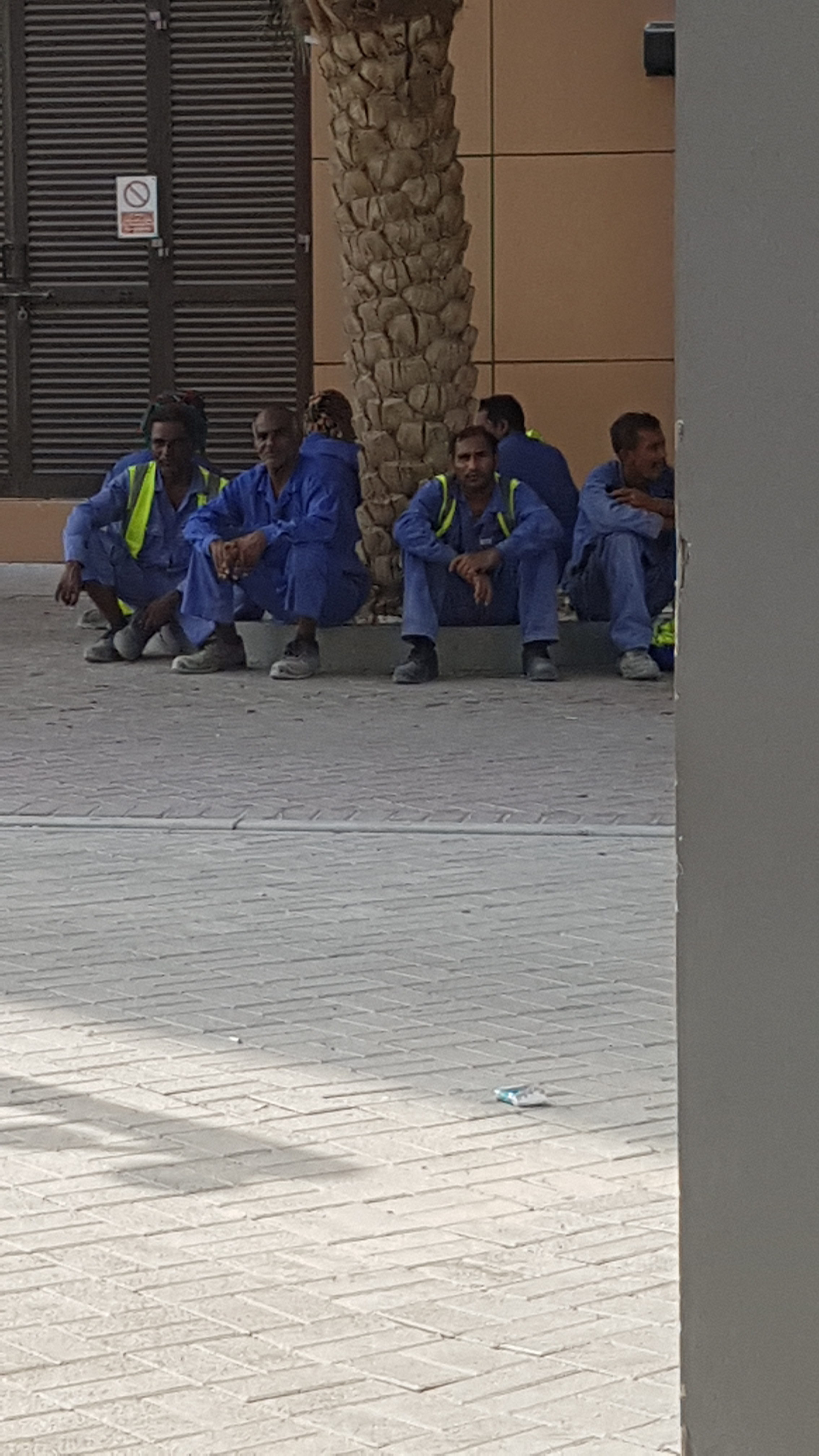 Come si può notare dalle foto (riprese con il cellulare, purtroppo, ma speriamo che rendano l’idea), queste lavoratrici e questi lavoratori sono quasi sempre immigrati dagli altri Paesi dell’Asia, molti dall’Africa. E svolgono mestieri faticosi, il più delle volte. Ci chiediamo come e dove vivano, quanto vengano pagati; che Futuro si aspettano – per sé o per i propri figli – e da quale Passato provengano…Ci sentiamo a disagio nel guardare il lusso che ci circonda – unico marchio dell’identità di Dubai – mentre fotografiamo i loro volti, i loro gesti, i loro passi: faccio un sorriso per far capire “da che parte sto”, per non sentirmi troppo in colpa, ma fortunata.