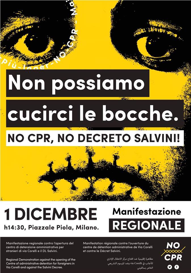 ● E’ ora stata preannunciata l’apertura di un CPR a Milano, in via Corelli 28, al posto di un centro di accoglienza che attualmente ospita oltre 300 richiedenti asilo, la cui sorte non è dato sapere, neppure ai diretti interessati.
