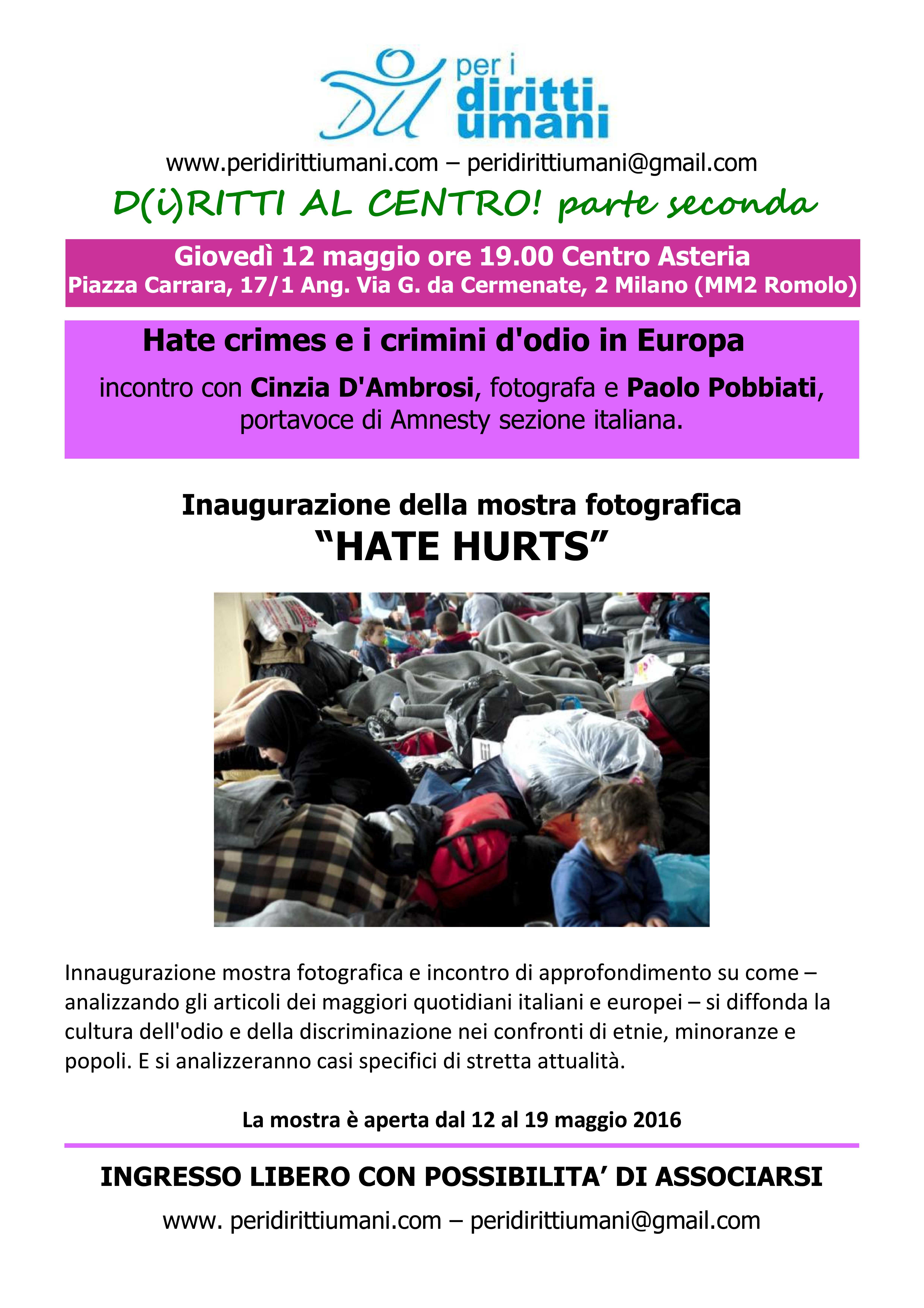 Incontro importante sui crimini d’odio in Europa (razzismo e discriminazioni) e sull’Hate speech. Importante perché saranno presenti la fotografa Cinzia D’Ambrosi che presenterà la sua mostra e Paolo Pobbiati, portavoce di Amnesty, sezione italiana. Siete...